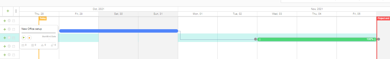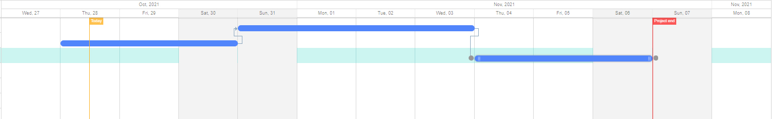 - When you want to create a dependency between two tasks, just hover the cursor over the first task, and grey circles will appear at both ends of the task
