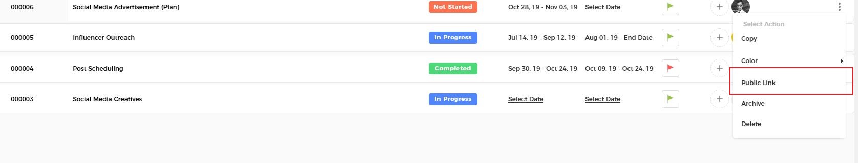 - Select ‘Public Link‘ from the drop-down menu. Doing so will open a pop-up window with the relevant task’s public link.